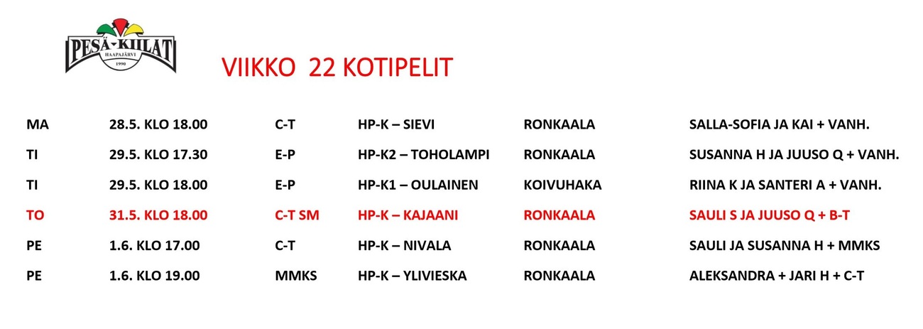 Viikon 22 kotipelit ja toimitsijavuorot
