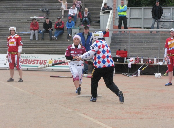 Naisten ykkösjoukkue pelasi lauantaina pilvisessä säässä Viinijärven Urheilijoita vastaan. Kotijoukkue vei pelin jaksoin 1-0. Pelin ensimmäinen jakso oli molemmilta joukkueilta melko vaisun oloinen. Hutunkeiton voittanut Viinijärvi onnistui tekemään pelin avausjuoksun hyvällä kolmospuolen välilyönnillä. Haapajärvellä tuntui olevan vaikeuksia saada etenijää kentälle, eikä se myöskään onnistunut tekemään yhtäkään juoksua ensimmäisen sisävuoronsa aikana. Toisessa vuoroparissa Pesä-Kiilat pelasi todella kovaa ulkopeliä, ja noin viiden minuutin kuluttua vuoronvaihdosta PeKi oli taas sisällä. Mutta myös Viinijärvi pelasi hyvää ulkopeliä, ja Pesä-Kiilojen vaihdot tuntuivat olevan hukassa. Kolmannessa vuoroparissa juoksuja tehtiin hieman enemmän. Viinijärvi sai jälleen kolmospuolen välilyönnillä juoksun, mutta kolmas palo tuli pian tämän jälkeen. Haapajärvikin sai avattua juoksutilinsä Mari Salmelan lyödessä läpi kakkospuolelta, tuloksena yksi juoksu. Pian tämän jälkeen Anu Koivuaho tasoittaa pelin tilanteeseen 2-2. Neljännessä vuoroparissa Viinijärven sisäpeli jäi jälleen lyhyeksi, mutta Pesä-Kiilatkaan ei onnistunut juoksun teossa vaikka pyöritti kolmostilannetta pitkään vuoronsa lopussa. Toisen jakson Haapajärvin aloittaa todella vahvasti. Pesä-Kiilojen ensimmäisen juoksun lyö Hanne Kähtävä, tuojana numero 1 eli Anu Koivuaho. Heti perään lyövät sekä Elisa Oravakangas että Marjo Salolahti molemmat yhden juoksun. Haapajärvi vaihtoi hyvin, ja Viinijärven ulkopelin pienen sähläyksen ansiosta sai myös neljännen juoksun. Viinijärven sisäpeli tuntui olevan hieman sekaisin Pesä-Kiilojen vahvan sisävuoron jälkeen, eivätkä vierailijat onnistuneet juoksun teossa. Toisessakin vuorossa Haapajärvi pelasi vahvasti, mutta ei saanut aikaan juoksuja. Viinijärvi sen sijaan avasi toisen jakson juoksutilinsä lyömällä yhden juoksun. Kolmannessa vuoroparissa Pesä-Kiilojen Niina Tiitto lyö läpi kolmospuolelta, tuloksena oli yksi juoksu. Hetkeä myöhemmin Niina vaihdettiin kakkoselta kolmoselle, jonne tämä kerkesi kompastumisestaan huolimatta. Viinijärvi sai hieman kasattua sisäpeliään, Soja Westersund rakensi ajolähdön, josta seuraavaksi lyömään tullut Saara Palomäki lyö juoksun. Viinijärvi pyörittää ajolähtöä, ja hetkeä myöhemmin Jenny Remes lyö myös juoksun. Viimeisen vuoroparin alussa PeKin voitto alkoi näyttää jo selvältä, ja se tyytyi kaunistelemaan voittonumeroita. Haapajärvi löikin kaiken kaikkiaan 8 juoksua. Kunnareita näistä oli kaksi, lyöjinä olivat Niina Tiitto ja Marjo Salolahti. Viinijärvi näytti aloittavan vahvasti, ja rakensi heti ajolähdön. Tytti Räsänen läpäisi tästä tilanteesta kolmospuolen, ja tuloksena oli kaksi juoksua. Viinijärvellä ei kuitenkaan saanut enää aikaiseksi juoksuja, vaan peli päättyi Haapajärven 1-0 (2-2, 14-5) voittoon. Pelissä palkittiin kotijoukkueelta hienon kuperkeikan tehnyt Niina Tiitto (I) ja hyvin pelannut Marjo Salolahti (II). Vierailijoiden palkinnot nappasivat Jenny Remes (I) ja Saara Palomäki (II). Paavo Laurila |