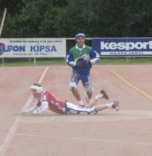 Pesä-Kiilat pelasi koleassa säässä tiukan pelin Kempeleen Kiriä vastaan. Molempien joukkueiden peli lähit käyntiin hieman kankeasti. Pesä-Kiilojen etukentän peliä saattoi mahdollisesti sekoittaa Joonas Rajalan poissaolo. Ensimmäisen jakson peli oli kokeilevan oloista, eikä kumpikaan joukkue erityisemmin loistanut ensimmäisen vuoroparin aikana. Pasi Seppälä löi kuitenkin Haapajärven avausjuoksun kyseisessä vuoroparissa. Kempele sai puolestaan avausjuoksunsa harhaheitolla, jota seurasi pian Mikko Vuorelan lyömä juoksu. Toisessa vuoroparissa Niilo Piiponniemi löi tasoitusjuoksun, jonka tuojana oli Heikki Savikoski. Kempele kuitenkin nousi johtoon omalla sisävuorollaan, jälleen kerran harhaheiton turvin. Pesä-Kiilat tasoitti jälleen pelin kolmannessa vuoroparissa. Kempele olisi mennyt johtoon, mutta ajolähdössä kakkospesältä lähtenyt juoksija esti polttajaa heittämästä, ja tuloksena oli kaksi paloa. Viimeisessä vuoroparissa Haapajärvi sai sisäpelinsä jo paremmalle mallille, tästä esimerkkinä Jarkko Nummelan kolmospuolen läpilyönti, jonka tuloksena oli etutilanne. Juho Kekkonen löi myös läpi, tällä kertaa takakentältä ja juoksi kahta metriä vaille kunnarin. Pasi Seppälä sai sitten vihdoin lyötyä juoksunkin läpilyönnillä, tuojana oli Heikki Savikoski. Kempele lähti kuitenkin hakemaan jaksovoittoa omalla sisävuorollaan, ja loppujen lopuksi se irtosikin Ossi Meriläisen kolmospuolen läpilyönnillä, josta syntyi kaksi juoksua. Myös pelin toinen jakso oli juoksurikas. Tähän osasyynä saattoi olla Pesä-Kiilojen ulkopelin haparointi, kuten myös Kempeleen todella hyvät vaihtolyönnit. Haapajärven sisäpeli oli kankeaa, ja ensimmäisen vuoroparin jälkeen tilanne olikin jo 0-2. Toiseen vuoropariin Pesä-Kiilat sai kuitenkin lyöntipelinsä käyntiin, ja Niilo Piiponniemi löi kolmospuolelta kunnarin ajolähtöön. Tuloksena tästä oli 1+2 juoksua ja yksi palo. Hieman myöhemmin Jarkko Nummela tasoitti pelin harhaheiton turvin tilanteeseen 4-4. Kempele pelasi kuitenkin hyvin edelleen, ja kolmannessa vuoroparissa Petteri Korpela löi ensin yhden etenijän kotiin ja viimeisellä lyönnillään toisen. Pesä-Kiilat kuitenkin tasoitti jälleen, kun Pasi Seppälä purki palottoman ajolähdön, tuloksena yksi juoksu, ja Niilo Piiponniemi löi heti perään toisen. Neljännessä vuoroparissa puntit olivat jälleen tasan, ja Kempele vaihtoi hyvin pelaajia kolmoselle ja sai lopulta myös yhden juoksun. Pesä-Kiilat yritti vielä tasoitusta, mutta joutui muutaman epäonnistuneen vaihtolyönnin vuoksi nöyrtymään KeKin edessä. Ottelun tuloksena oli siis Kempeleen 0-2 (4-5, 6-7) voitto. Ottelussa palkittiin kotijoukkueelta Niilo Piiponniemi (I) ja Pasi Seppälä (II), sekä vierasjoukkueelta Ossi Meriläinen (I) ja Petteri Korpela (II). |