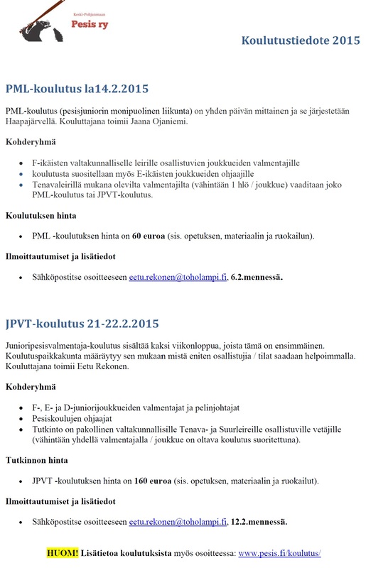Keski-Pohjanmaan Pesis järjestää koulutusta alueellamme. Tutustu ja ilmoittaudu mukaan. Huomioikaa, että esim. Napero- ja Tenavaleirillä vaaditaan PML-koulutus. JPVT-koulutusta vaaditaan Suurleirillä, mutta toki käy myös pienempien leireillä. Haapajärviset ilmoittautukaa Jaanalle eli jaana.ojaniemi@haapajarvi.fi, niin hoidamme ilmoittautumiset kootusti. Ilmoittaudu 5.2. mennessä! PML-koulutus järjestetään Haapajärvellä la 14.2. ja JPVT 21.-22.2. (paikka avoin) Pesä-Kiilat maksaa haapajärvisten koulutukset. Lisätietoja koulutuksista löydät Pesäpalloliiton sivuilta. Liitteet