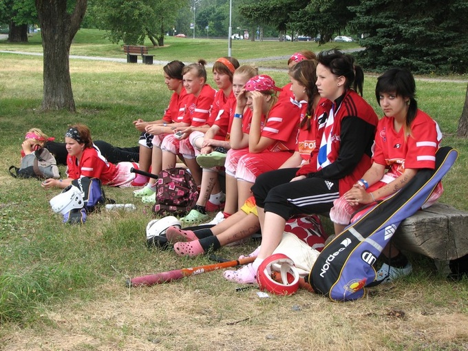![]() Vaihtelevaa jalkinemuotia - paljain jaloin, sukkasillaan, lenkkareilla - piikkareita ei tällä kentällä saanut käyttää. |